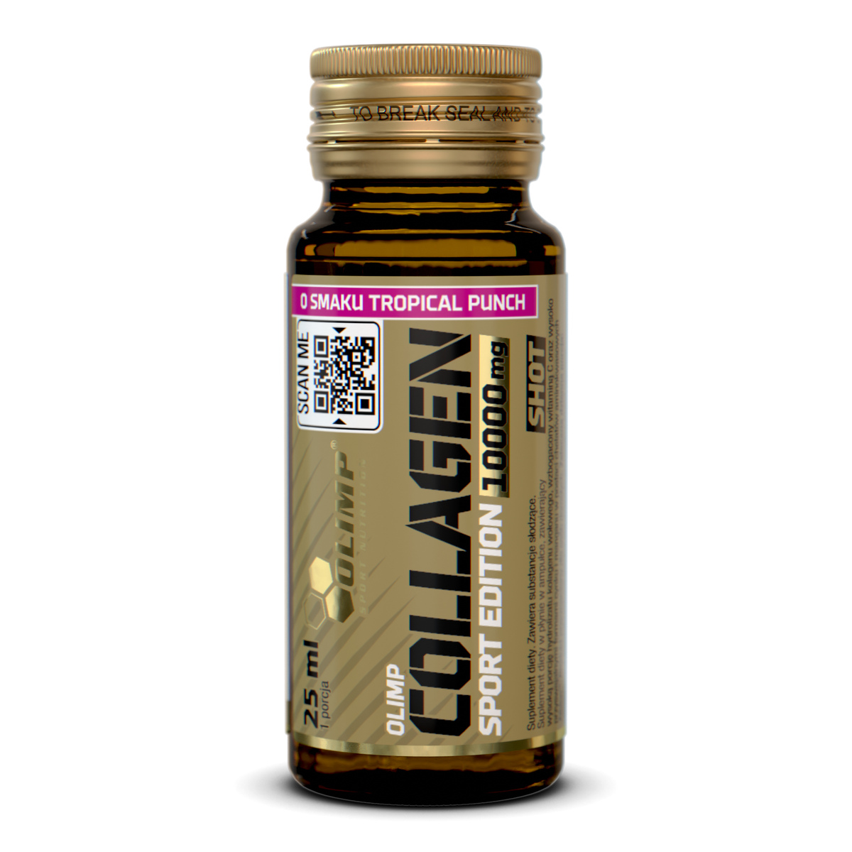 Olimp Collagen Sport Edition Shot – suplement diety. Zawiera substancje słodzące. Suplement diety w płynie w ampułkach, zawierający wysoka porcje hydrolizatu kolagenu wołowego, wzbogacony witamina C oraz wysoko przyswajalnymi formami cynku i manganu w postaci chelatów aminokwasowych Albion™. O smaku Tropical Punch.