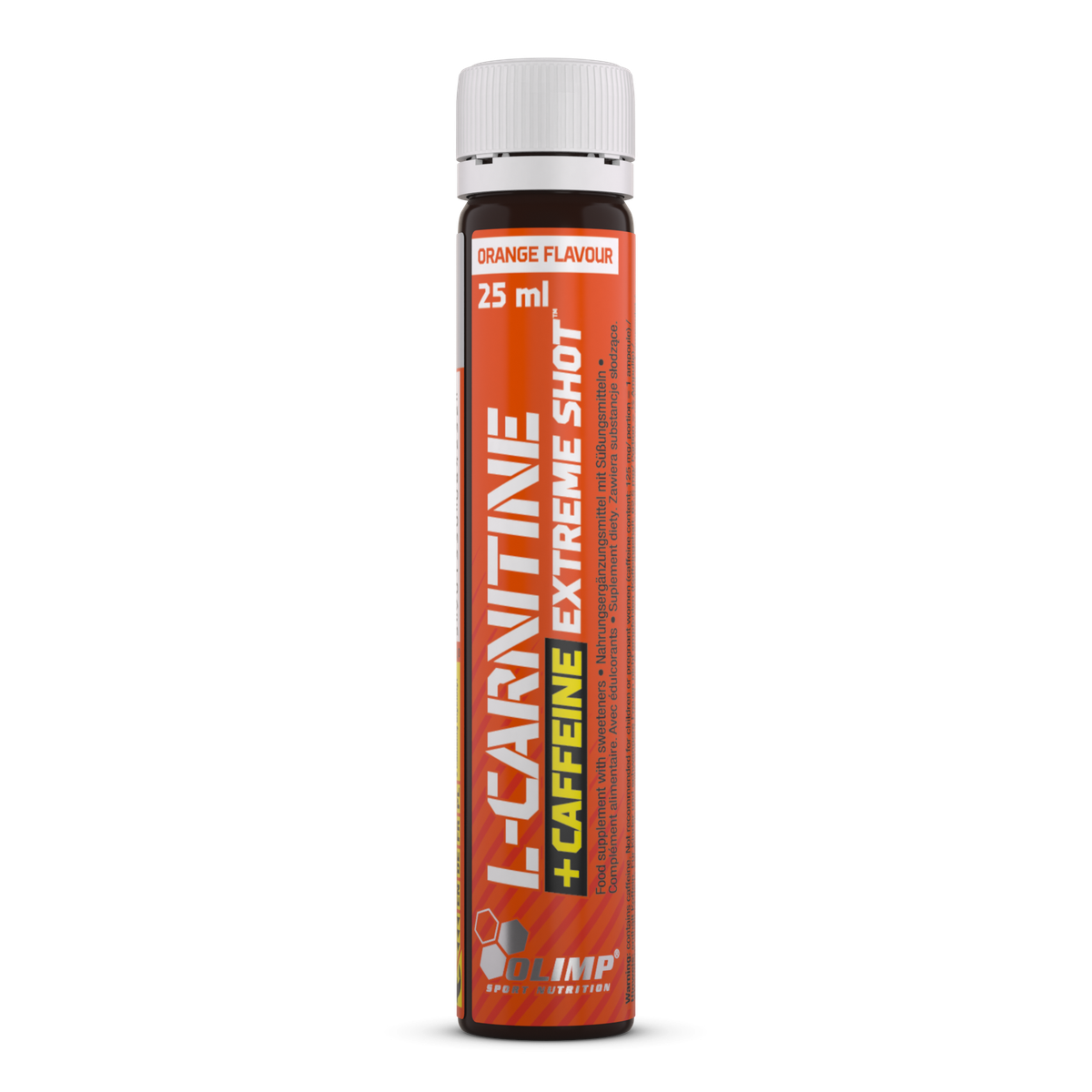Olimp L-Carnitine + Caffeine Extreme Shot - suplement diety w płynie, zawierający L-karnitynę, kofeinę i witaminę B6. Zawiera substancje słodzące. O smaku pomarańczowym. Ampułka 25 ml.
