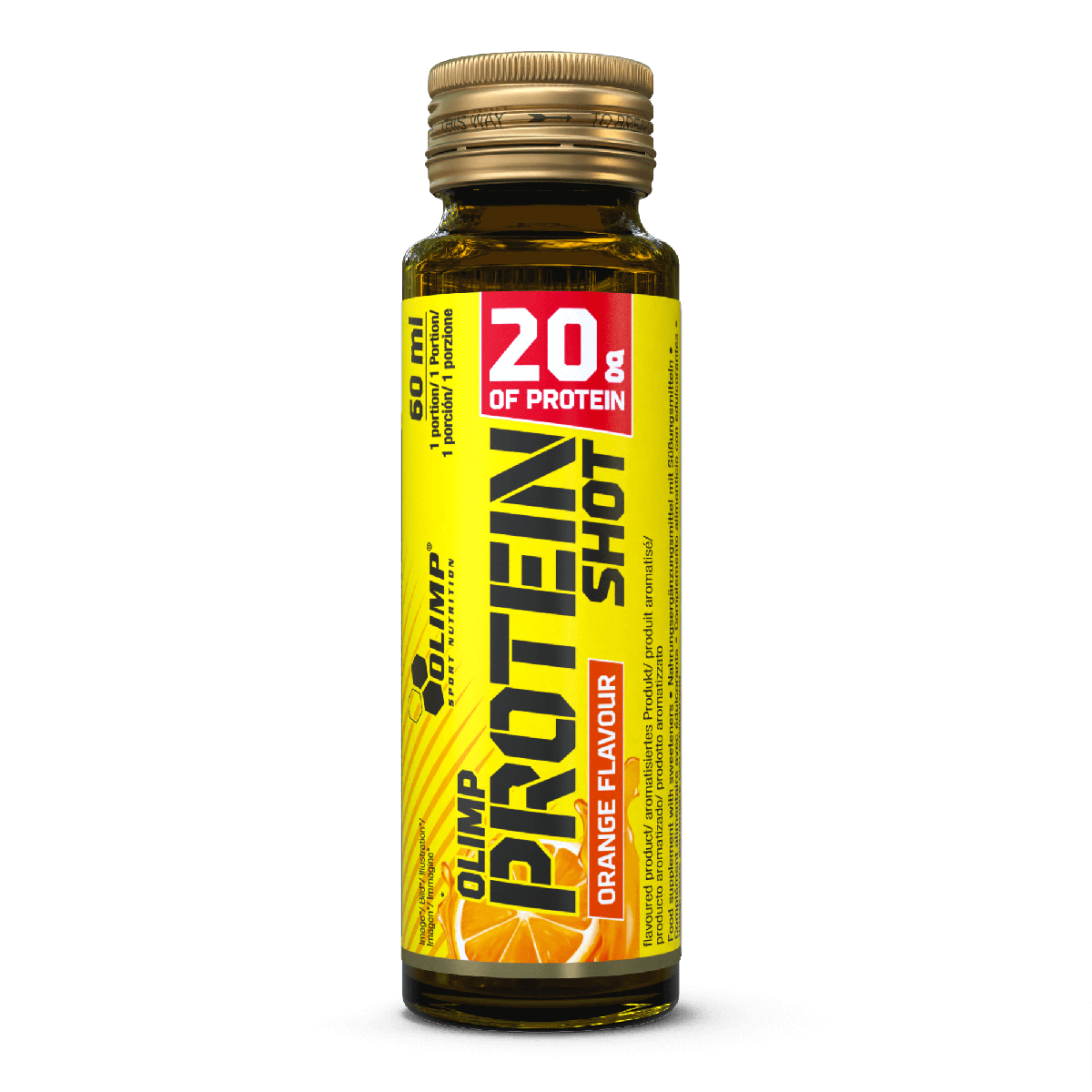 Olimp Protein Shot – suplement diety. Zawiera substancje słodzące. Wysokobiałkowy koncentrat w płynie w ampułkach 60 ml. O smaku pomarańczowym. 1Nie zawiera tłuszczu. Formuła składników zawierająca wysokiej jakości kolagen typu I oraz hydrolizat białek serwatkowych. Białko przyczynia sie do wzrostu i utrzymania masy miesniowej.